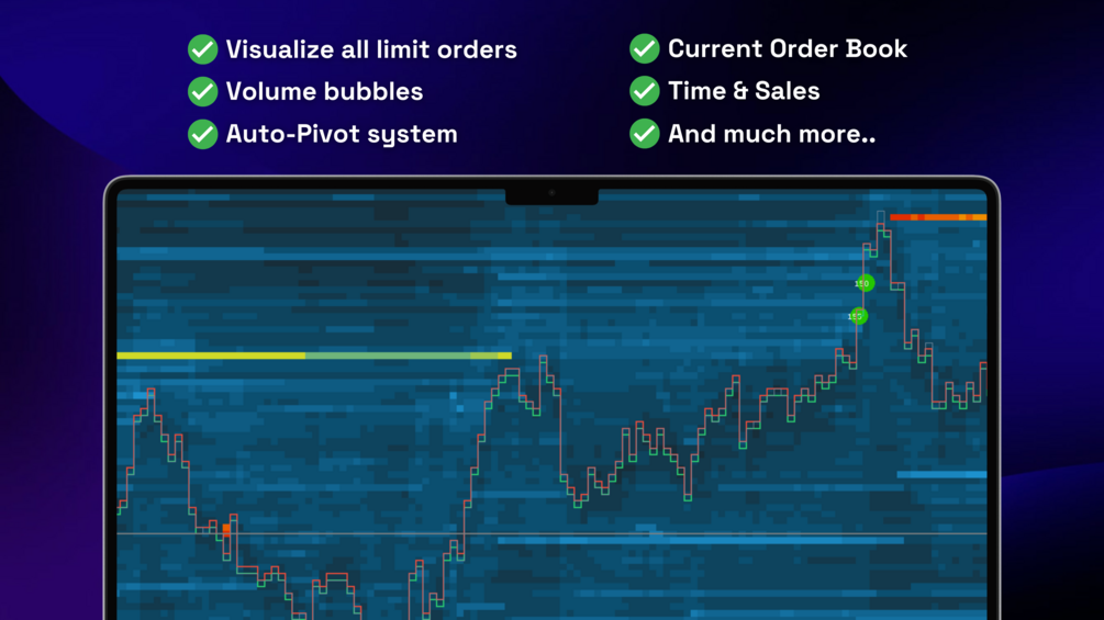 A Liquidity heatmap provides you with a highly effective way to analyze the order flow, identify actual levels of support and resistance, and make smarter trading decisions. It displays the density of buy and sell orders at various price levels. It uses color-coded shading to represent the volume of these limit orders, with different colors indicating varying levels of liquidity. This enables traders to quickly identify where significant buying and selling interest lies in the market. Stop trading in the dark and start seeing all the limit orders being posted on the exchange over time.
